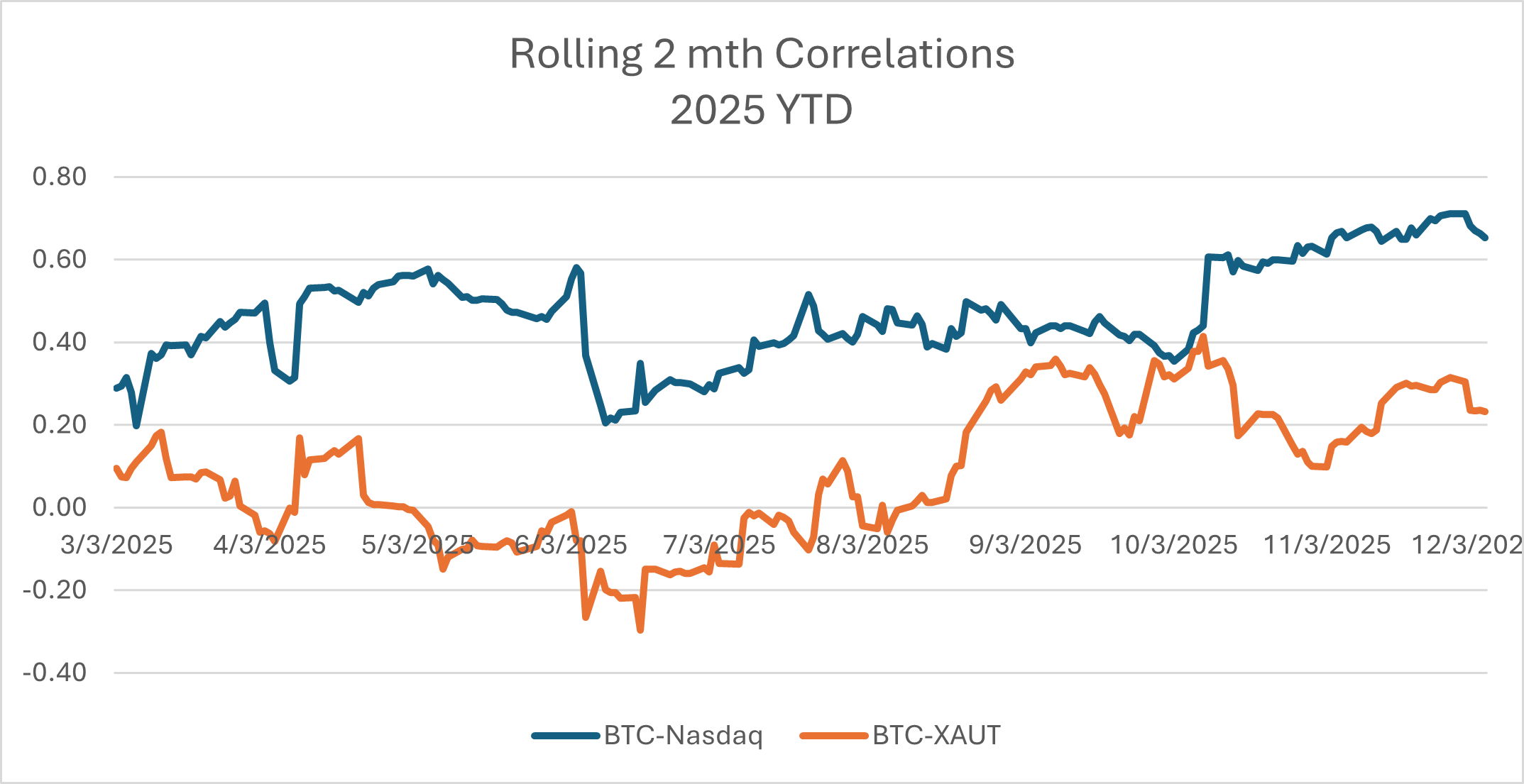 The US government shutdown for a record-breaking 43 days ending on November 12 did not do the market any favors either. The US economy slowed (the government wasn’t spending), and employment and inflation data with which to judge interest rate policy were missing, both leaving the market uncertain. Over this shutdown period, the aspirational narrative of BTC being a digital version of gold did not hold up to scrutiny. BTC dropped 11% while gold gained about 8%. Indeed, year-to-date, correlations tell us that BTC is acting more like technology stocks although the narrative of BTC being a digital safe-haven currency may yet play out in the long run.