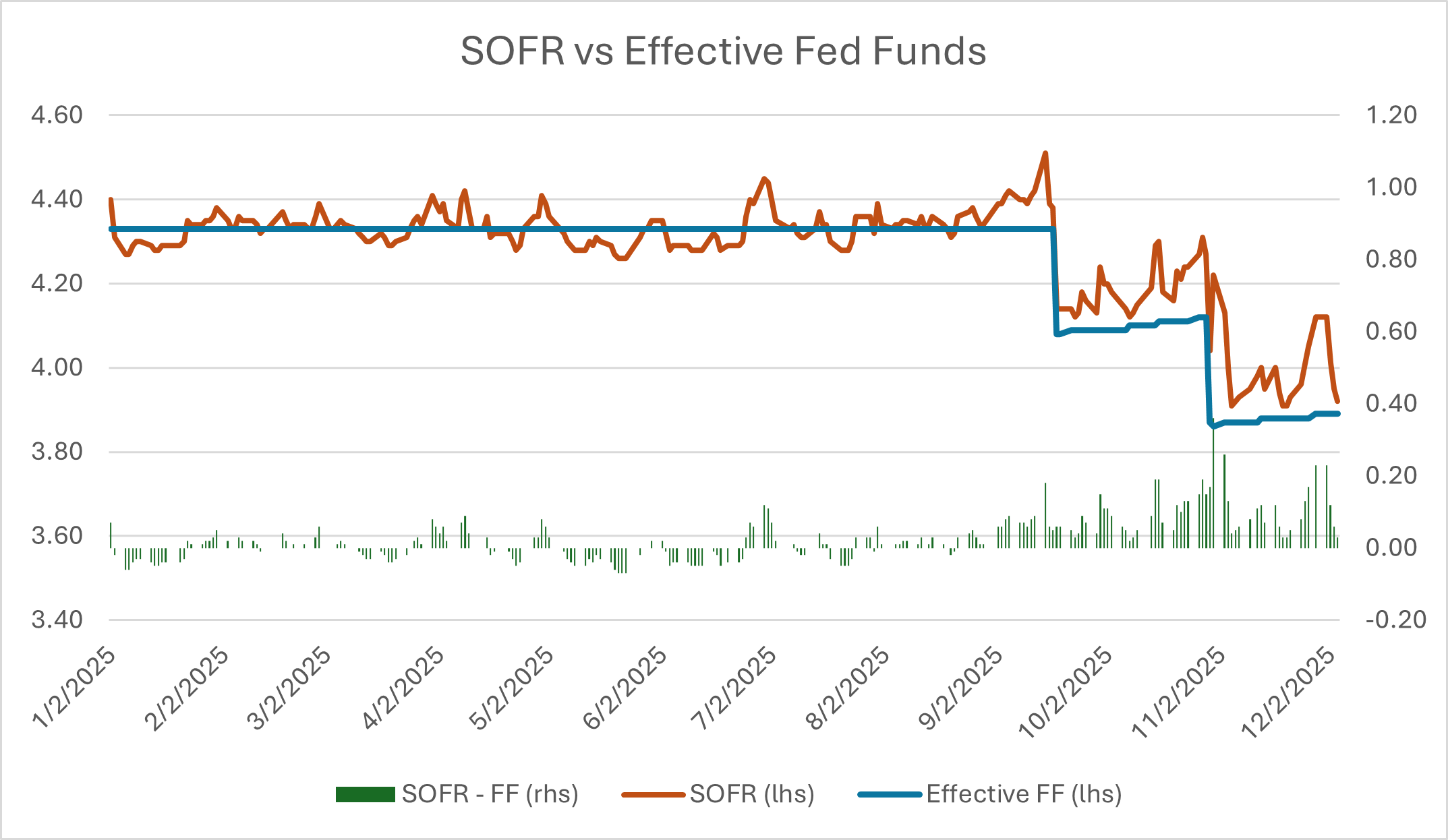 Investors are therefore turning to the Fed. With the US government re-opening and economic data flowing again, the Fed delivered a 25 bps rate cut on December 10 to target its Fed Funds rate to a range of 3.50% to 3.75%. Lower rates and improved market liquidity should be a boost to risk and long-duration assets, but the crypto-markets haven’t reacted as positively as one may hope for. Perhaps this is due to the concerns that liquidity may not be as abundantly available as suggested simply by the US policy rates. One indicator to watch is the spread of the Secured Overnight Financing Rate (SOFR) versus the Effective Fed Funds (FF) rate. SOFR should generally be equivalent to the FF rate given that these are rates that price repurchase agreements (repos) secured by US Treasury. However, since President Trump’s announcement of tariffs on China in early October, the SOFR-FF spread has remained persistently positive, hinting at lingering stresses in the credit system.