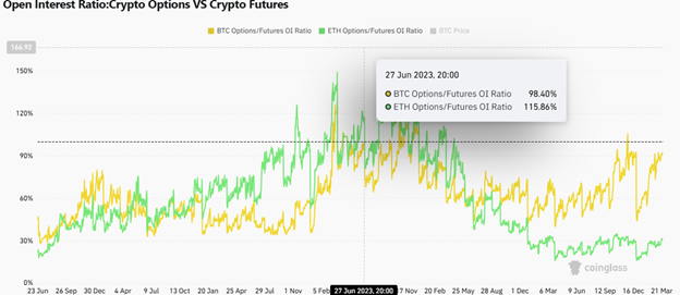 Crypto options to futures open interest. Source: Coinglass.