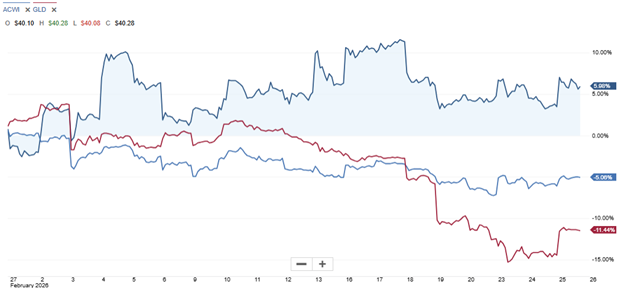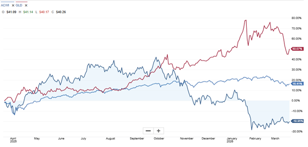 Risk asset ETF price behaviours post 28-Feb-2026. IBIT (iShares BTC Trust) is dark blue, ACWI (iShares MSCI ACWI , i.e., global equities) is light blue, and GLD (SPDR Gold Trust) is red. Source: Schwab.