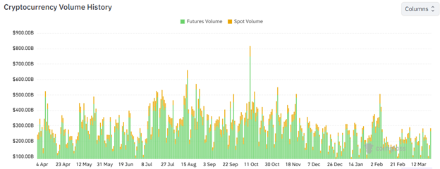 Crypto market spot and futures volumes over the past 12 months. Source: Coinglass.