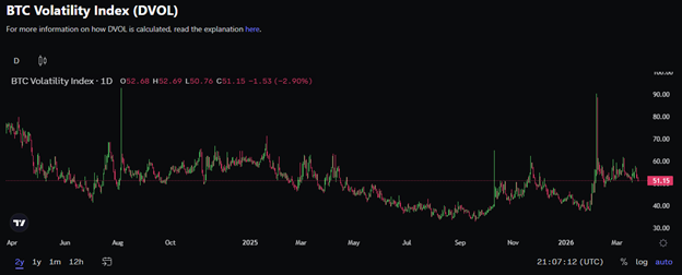 The Deribit exchange provides active options trading in BTC, ETH and other tokens. Quite importantly, it also provides insightful metrics. The exchange calculates a BTC Volatility Index (DVOL) that is a metric of expected volatility of BTC prices based on its options market. This index has recently “normalized” around 50% per annum from its lows in the summer of 2025 and after a brief spike up to around 90% in early February 2026 when BTC dropped to its recent lows below $64,000.